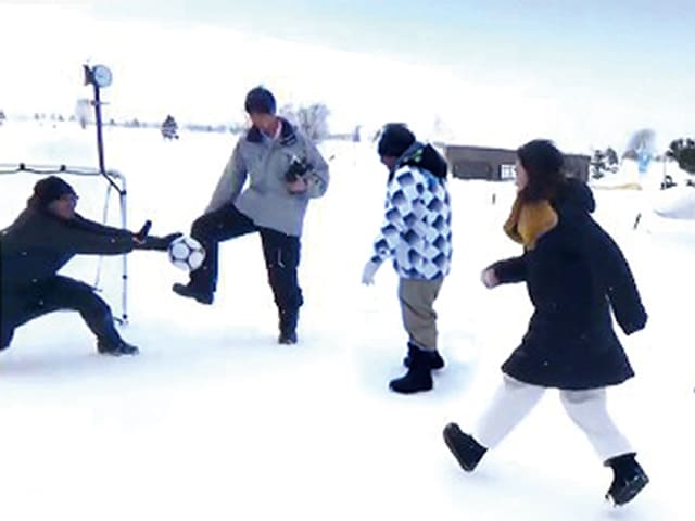 雪の上でのミニゴールへのシュート練習。サッカーの楽しさを雪の中でも体験できるユニークなアクティビティです。